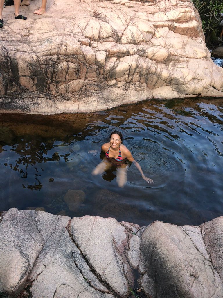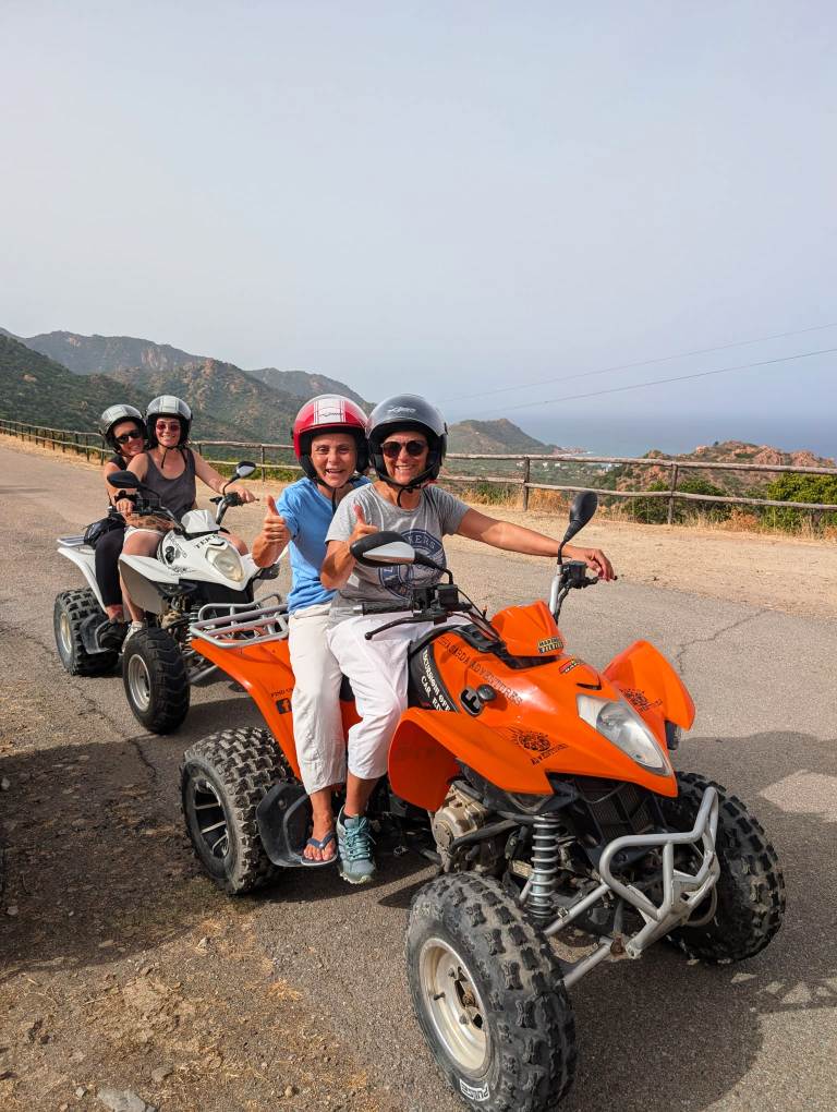 Ma noi siamo motocicliste d’animo indomito e con tanta speranza e abbiamo Stefano, il Direttore dell’Hotel, che con la saggezza di un druido sardo (e l’esperienza di un ex motociclista) ci consiglia una spiaggia protetta dal vento per la mattinata e mi conferma la possibilità di fare un’escursione in quad. Risultato? Polvere ovunque, risate a non finire e bagni in piscine naturali che sembrano uscite da una fiaba.