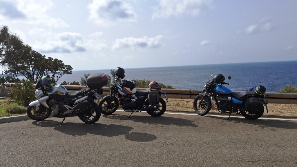 Direzione Villasimius tra curve che sembrano disegnate da Dalì e un venticello che ci salva dal casco effetto sauna.